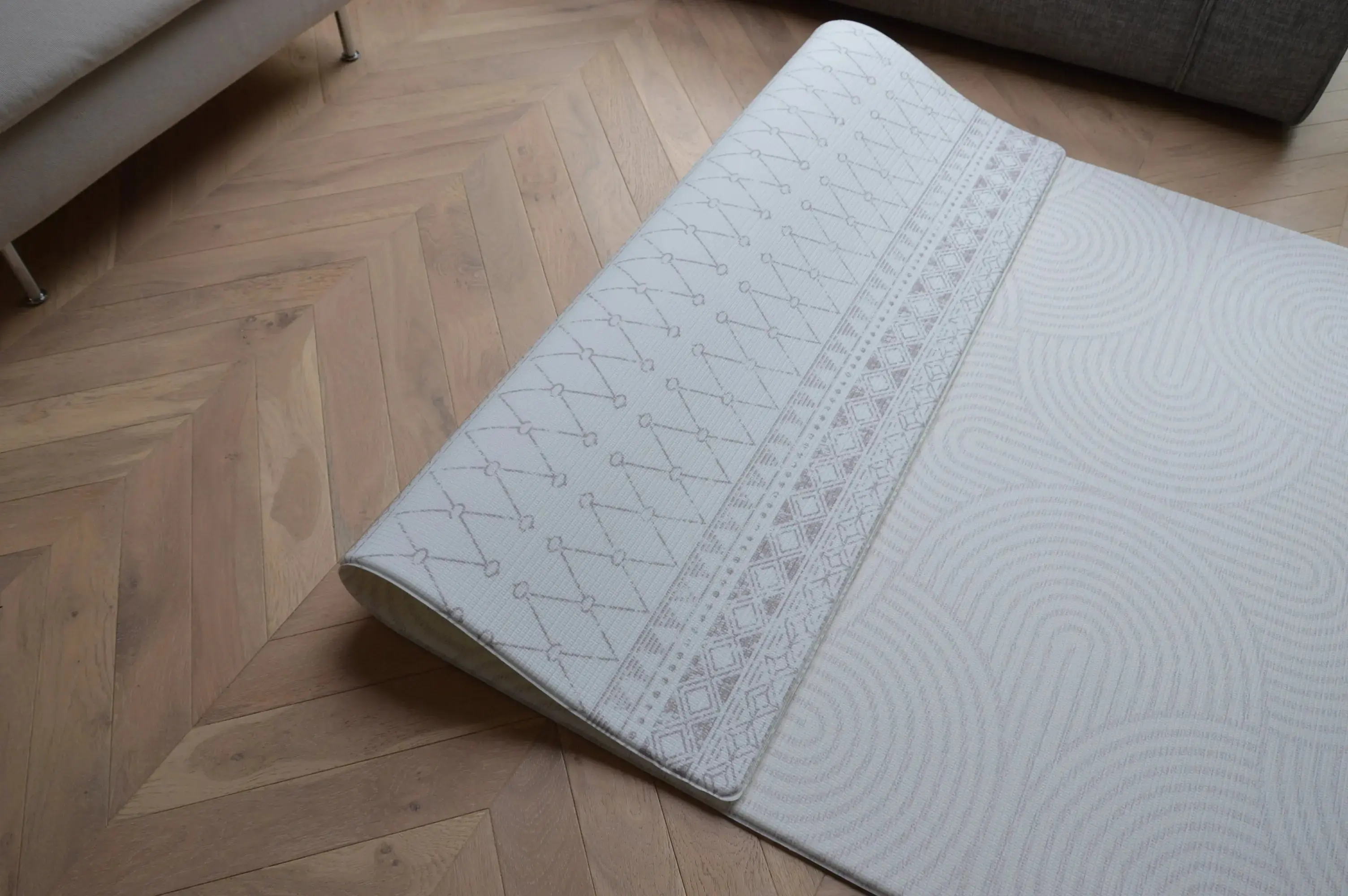 Boho: On side B There's a neutral boho vintage design, that will suit any living space. With an off white/cream colour tone, this playmat will blend seamlessly with your space and complement most colour palettes.